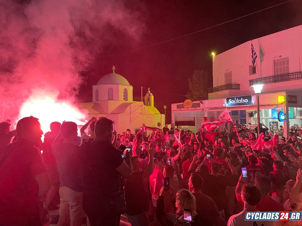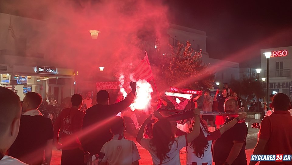 Εκατοντάδες οπαδοί του Ολυμπιακού βγήκαν στους δρόμους στη Νάξο, μετά την κατάκτηση του ευρωπαϊκού τίτλου από την ομάδα τους στον τελικό του Conference League.