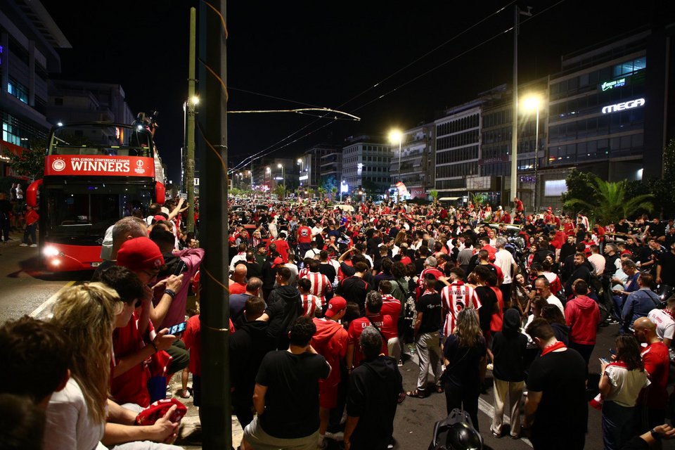 Τα ξημερώματα το ανοιχτό πούλμαν με τους παίκτες του Ολυμπιακού έφτασε στο Δημοτικό Θέατρο Πειραιά, όπου χιλιάδες φίλαθλοι υποδέχθηκαν και αποθέωσαν τους θριαμβευτές του Conference League.