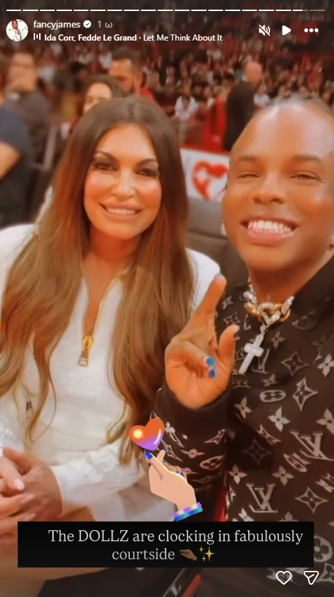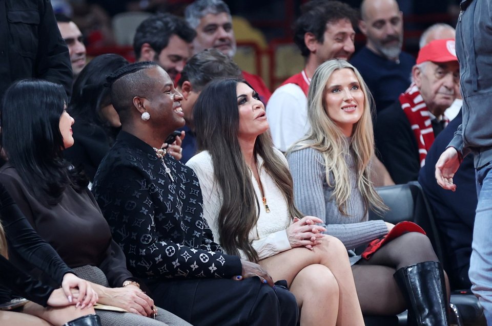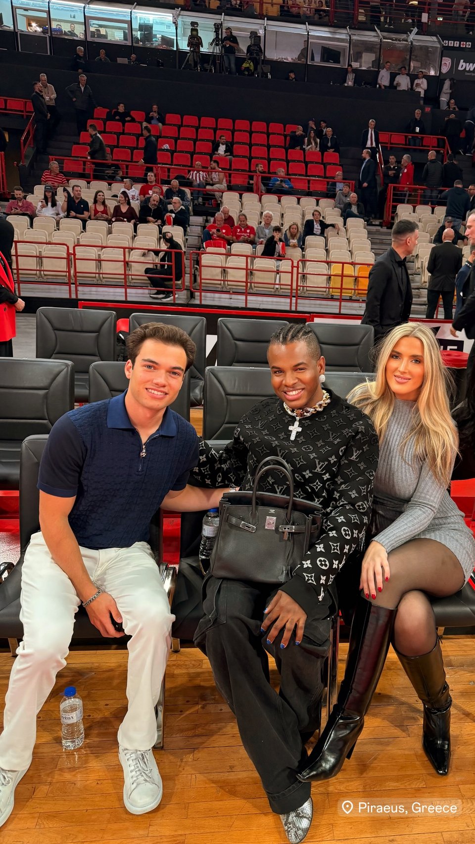 Μαζί της ήταν ο γιος της, Ρόναν, δύο ξανθιές φίλες του (που φωτογραφήθηκαν με τη μασκότ του Ολυμπιακού), καθώς και ο στιλίστας της Fancy James, που τη συνοδεύει παντού και επιμελείται τα λουκ της.
