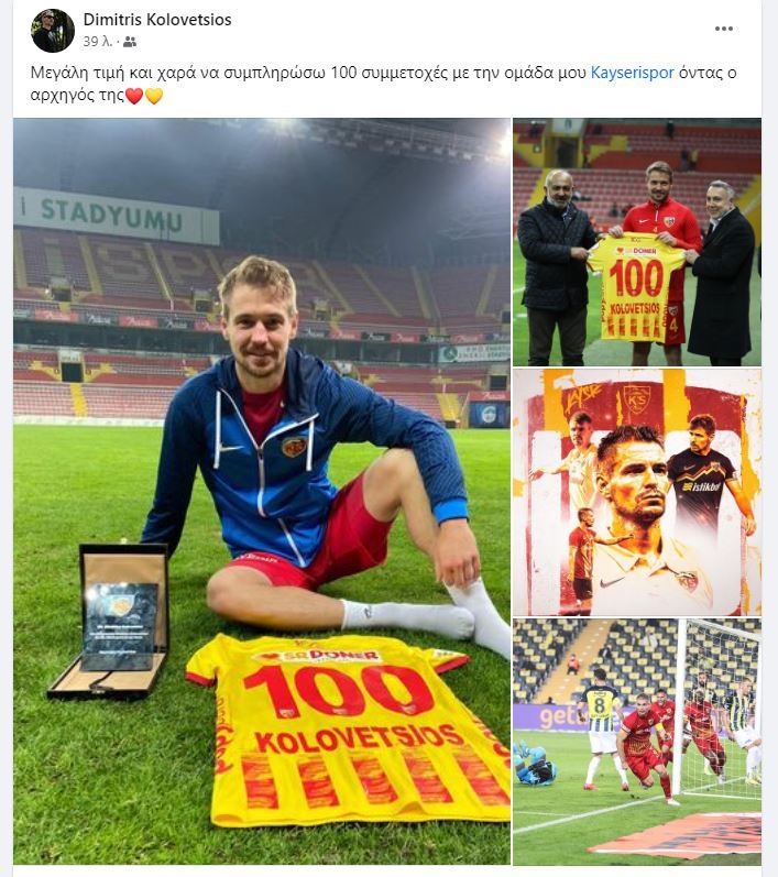 «Μεγάλη τιμή και χαρά να συμπληρώσω 100 συμμετοχές με την ομάδα μου Kayserispor όντας ο αρχηγός της», έγραψε στο Facebook ο Κολοβέτσιος.
