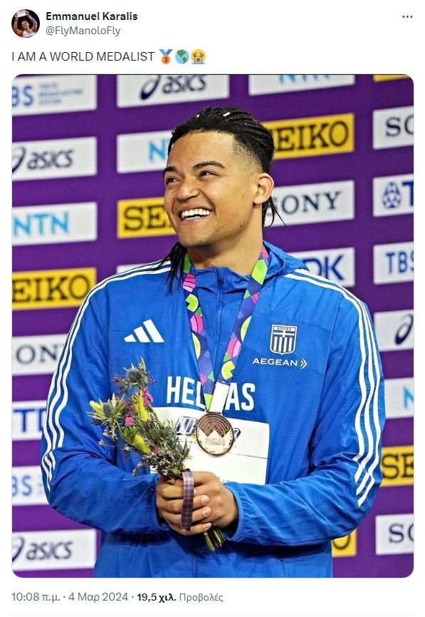 Σε ανάρτησή του λοιπόν στο X (πρώην Twitter), ο Εμμανουήλ Καραλής έγραψε στα αγγλικά: «I am a world medalist» προσθέτοντας emoji χάλκινου μεταλλίου, την υδρόγειο και ένα πρόσωπο που κλαίει.