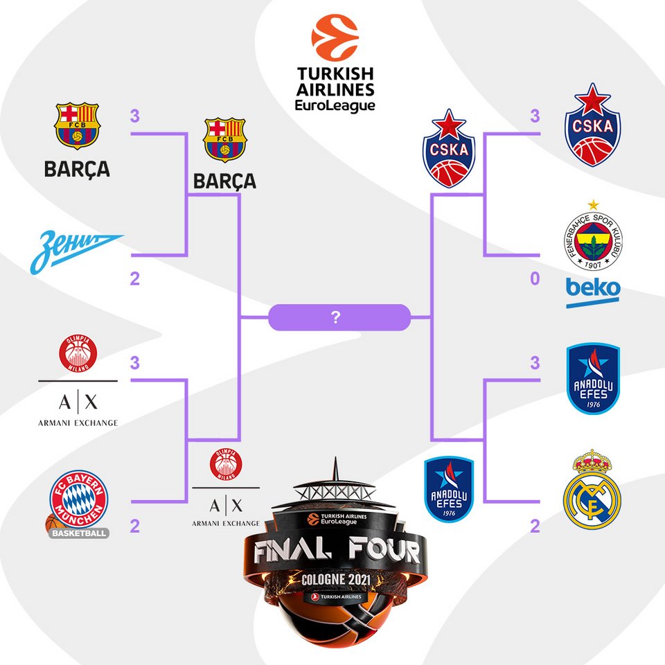 Η Αρμάνι θα μονομαχήσει στον ημιτελικό του Final-4 της Κολωνίας με την Μπαρτσελόνα, ενώ στον άλλο ημιτελικό η ΤΣΣΚΑ του Δημήτρη Ιτούδη, θα βρεθεί απέναντι στην Εφες. Οι ημιτελικοί θα διεξαχθούν στις 28 Μαΐου, ενώ ο τελικός θα διεξαχθεί στις 30 Μαΐου.