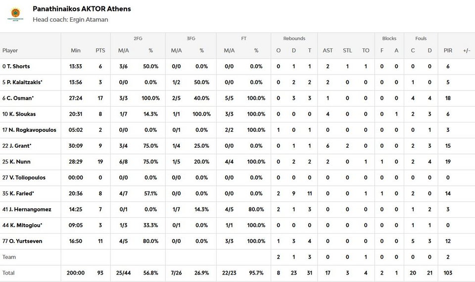 Πρώτος σκόρερ του Παναθηναϊκού ο συνήθης ύποπτος Κέντρικ Ναν με 19 πόντους, ενώ στους 17 σταμάτησε ο Τσεντί Όσμαν και στους 11 ο Ομέρ Γιούρτσεβεν.