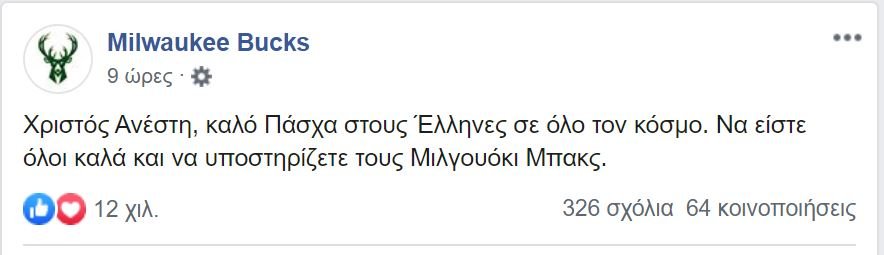 «Χριστός Ανέστη, καλό Πάσχα στους Έλληνες σε όλο τον κόσμο. Να είστε όλοι καλά και να υποστηρίζετε τους Μιλγουόκι Μπακς», ανέφεραν χαρακτηριστικά.