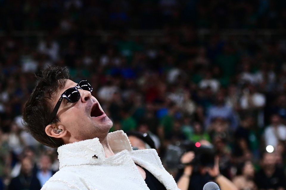 Αμέσως μετά εισήλθε στο παρκέ ο γνωστός τραγουδιστής και ερμηνευτής του «Μέχρι Τέλους», Νίνο, ο οποίος τραγούδησε τον «ύμνο», όπως έχει εξελιχθεί, ξεσηκώνοντας το ΟΑΚΑ.