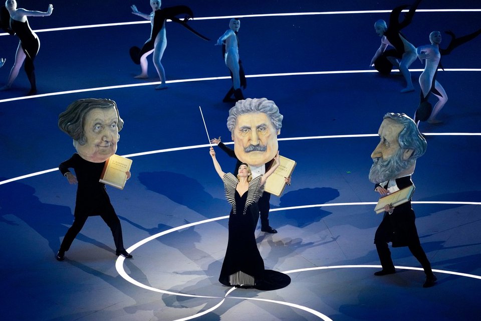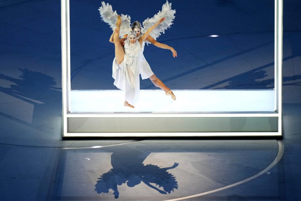 Χορευτές από την φημισμένη ακαδημία του Teatro alla Scala χάρισαν με ρυθμό χειμερινά αθλήματα. Αργότερα, εμφανίστηκαν τρεις φιγούρες με μεγάλα κεφάλια , που αντιπροσώπευαν τρεις από τους μεγαλύτερους συνθέτες της ιταλικής κλασικής μουσικής : τον Τζουζέπε Βέρντι, τον Τζάκομο Πουτσίνι και τον Τζοακίνο Ροσίνι.