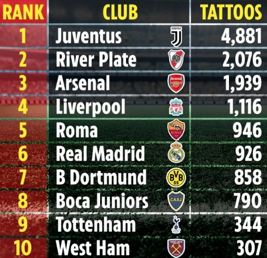 Οι οπαδοί της Γιουβέντους έχουν «χτυπήσει» τα περισσότερα τατουάζ για την ομάδα τους από κάθε άλλο κλαμπ στον πλανήτη, σύμφωνα με έρευνα ιστοσελίδας στις φωτογραφίες του Instagram. Πρώτη η Άρσεναλ από Αγγλία, δεύτερη συνολικά η Ρίβερ Πλέιτ.