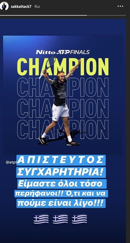 Η Ελληνίδα τενίστρια, που πρόσφατα σε συνέντευξή της είπε πως με τον Τσιτσιπά είναι απλά φίλοι, ανέβασε ένα ποστ στο Instagram, αποθεώνοντάς τον, για τη νίκη του στον τελικό του ATP Finals στο Λονδίνο.