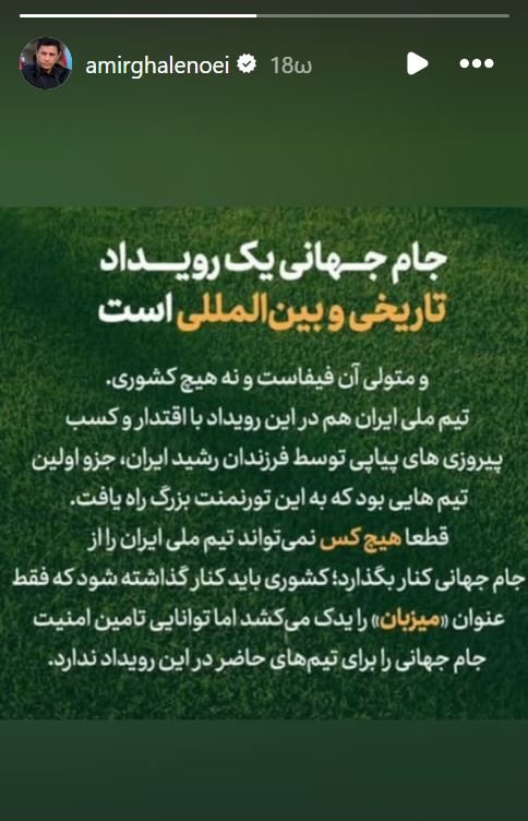 «Το Παγκόσμιο Κύπελλο είναι μια ιστορική και διεθνής διοργάνωση και το διοικητικό του όργανο είναι η FIFA, όχι κάποια μεμονωμένη χώρα. Η εθνική ομάδα του Ιράν, με τη δύναμη και μια σειρά από αποφασιστικές νίκες που πέτυχαν οι γενναίοι γιοι του Ιράν, ήταν μεταξύ των πρώτων ομάδων που προκρίθηκαν σε αυτό το μεγάλο τουρνουά», ανέφερε η ομάδα σε ανακοίνωσή της.