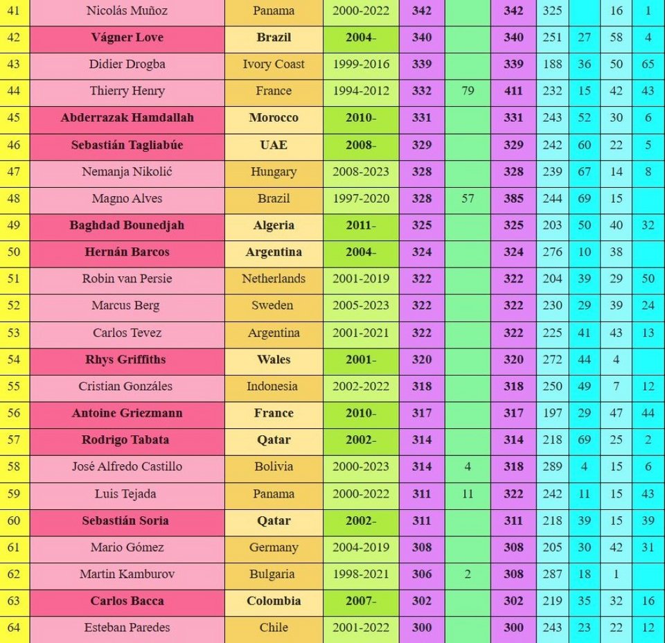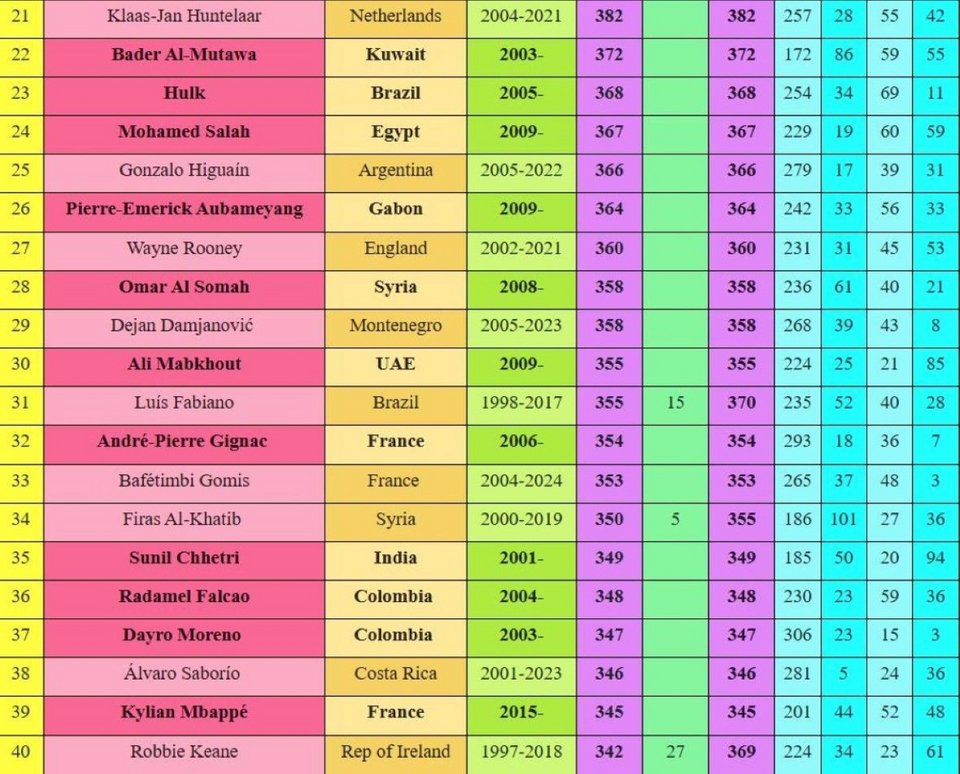 Ειδικότερα, στην 19η θέση βρίσκεται ο Όσκαρ Καρντόσο με 388 τέρματα, ο οποίος τη σεζόν 2016-17 φόρεσε τη φανέλα του Ολυμπιακού, έχοντας αγωνιστεί 34 φορές και πετυχαίνοντας μόλις τρία γκολ. Στα 41, ο Παραγουανός στράικερ δεν έχει αποσυρθεί, καθώς συνεχίζει να βρίσκει δίχτυα με τη φανέλα της Λιμπερτάντ.
