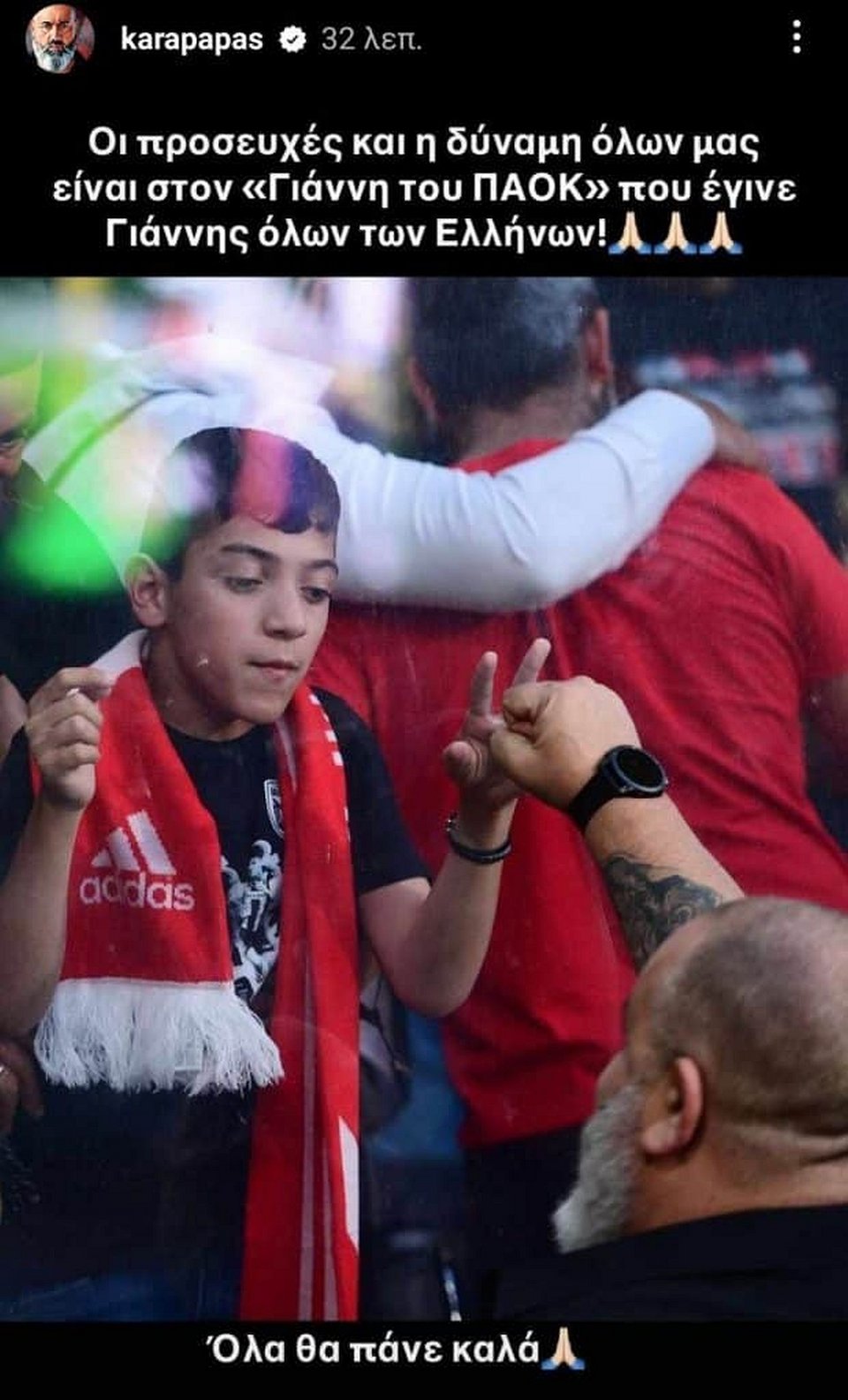«Οι προσευχές και η δύναμη όλων μας είναι στον "Γιάννη του ΠΑΟΚ" που έγινε Γιάννης όλων των Ελλήνων. Όλα θα πάνε καλά», έγραψε σε story που έκανε στο Instagram.