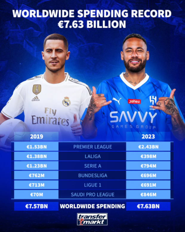 Με την έλευση της πανδημίας το 2020, τα έσοδα πολλών συλλόγων έπεσαν κατακόρυφα και ακόμα όπως θα δείτε και με τα στοιχεία που δίνει στη δημοσιότητα το transfermarkt.com, παραδοσιακά πρωταθλήματα της Ευρώπης, όπως το ισπανικό και το ιταλικό δεν έχουν φτάσει ακόμη στα επίπεδα προ κορωνοϊού, ωστόσο το κενό καλύπτει η Premier League, καθώς οι αγγλικοί σύλλογοι ξόδεψαν το φετινό καλοκαίρι 2,43 δισ. ευρώ σε μεταγραφές, ενώ αίσθηση προκαλεί και η Λίγκα της Σαουδικής Αραβίας, της οποία οι ομάδες το 2019 είχαν ξοδέψει συνολικά 70 μόλις εκατομμύρια ευρώ το 2019, ενώ το 2023 έφτασαν τα 846 εκατομμύρια.