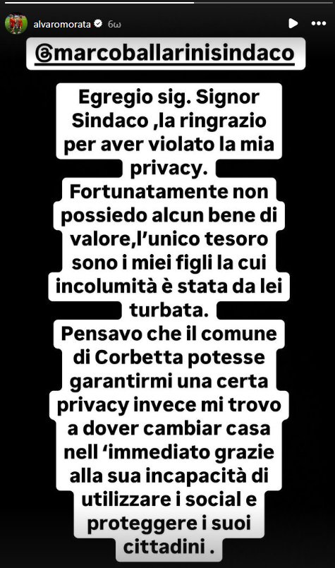 «Αγαπητέ κύριε δήμαρχε, σας ευχαριστώ για την παραβίαση της ιδιωτικής μου ζωής. Ευτυχώς, δεν έχω καμία πολύτιμη περιουσία. Ο μόνος μου θησαυρός είναι τα παιδιά μου, των οποίων την ασφάλεια έχετε θέσει σε κίνδυνο», έγραψε ο Μοράτα στο Instagram.
