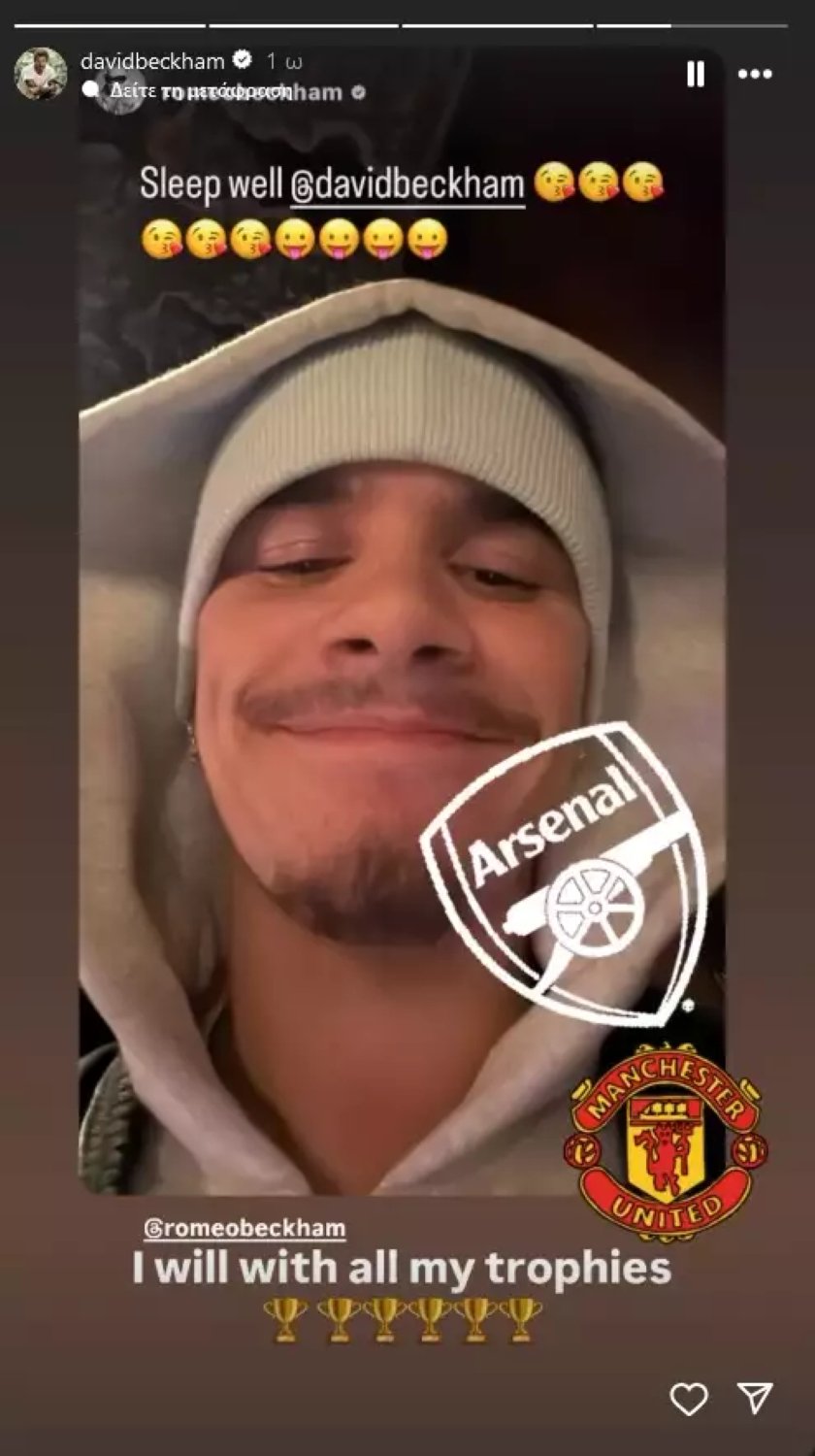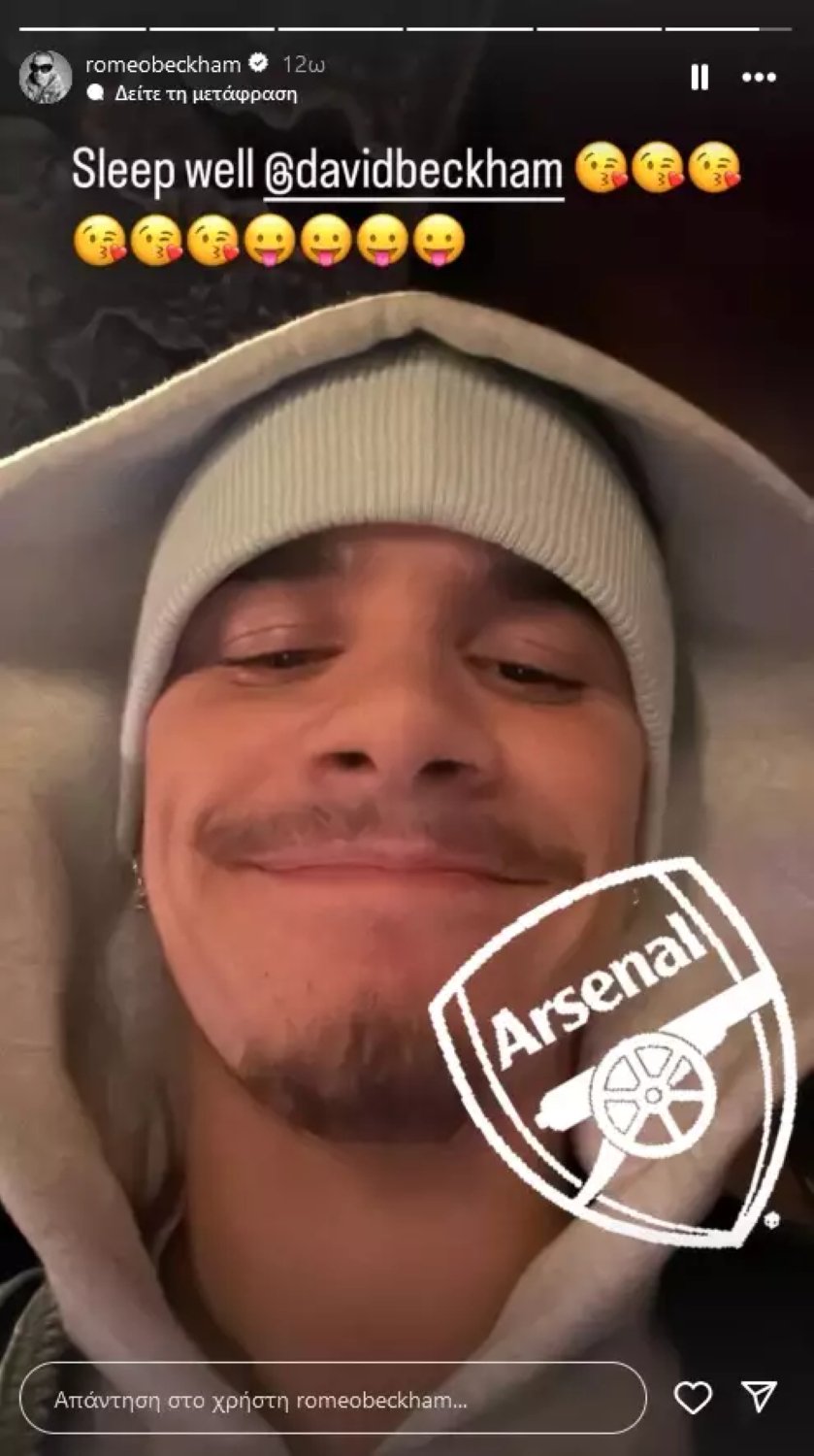 «Κοιμήσου καλά Ντέιβιντ Μπέκαμ», έγραψε σε story του στο Instagram ο χαμογελαστός Ρομέο, βάζοντας αρκετές φατσούλες και το σήμα της Άρσεναλ.