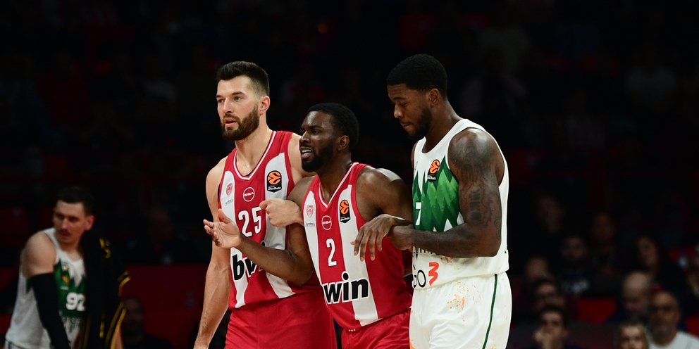 Λίγο πριν το τέλος της πρώτης περιόδου και με τον Ολυμπιακό να κάνει πάρτι κόντρα στην Ζάλγκιρις, ο Κίναν Έβανς πέρασε στο παρκέ στο 2:16