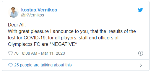 «Με μεγάλη χαρά σας ανακοινώνω ότι, τα αποτελέσματα για τον κορωνοϊό στους παίκτες και το προσωπικό του Ολυμπιακού, είναι αρνητικά», έγραψε χαρακτηριστικά στον προσωπικό του λογαριασμό ο Κώστας Βερνίκος.