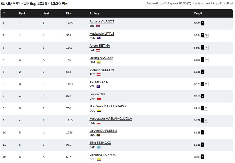 Τελικά με 60,98μ. μπήκε η 12η στον τελικό, η Κολομβιανή Μπάριος, ενώ ένα από τα κορυφαία ονόματα της τελευταίας 10ετιας, η ολυμπιονίκης Χαρούκα Κιταγκούτσι, έμεινε 14η με 60,38μ και εκτός τελικού.