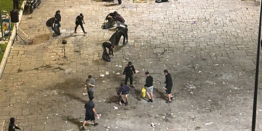 Οι οπαδοί του ΠΑΟΚ παραμέρισαν την απογοήτευσή τους από την ήττα από την Μπιλμπάο και μετά το τέλος του αγώνα καθάρισαν την πλατεία Ναυαρίνου.