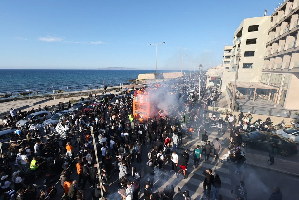Η πομπή ξεκίνησε από το ιστορικό «Γεντί Κουλέ» και θα καταλήξει στο κέντρο της πόλης, με τους φίλους του ΟΦΗ να ετοιμάζουν μια ατμόσφαιρα που θύμισε… ευρωπαϊκή πρωτεύουσα τίτλου.
