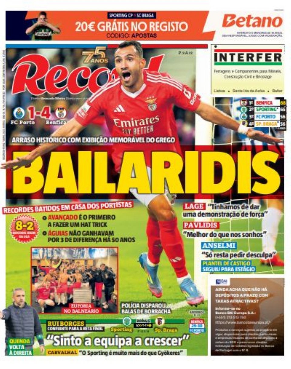 «Καταστροφή», γράφει η «A Bola», κάνοντας λόγο για «ονειρεμένη βραδιά για τον Παυλίδη με χατ τρικ στο Νταγκάο».