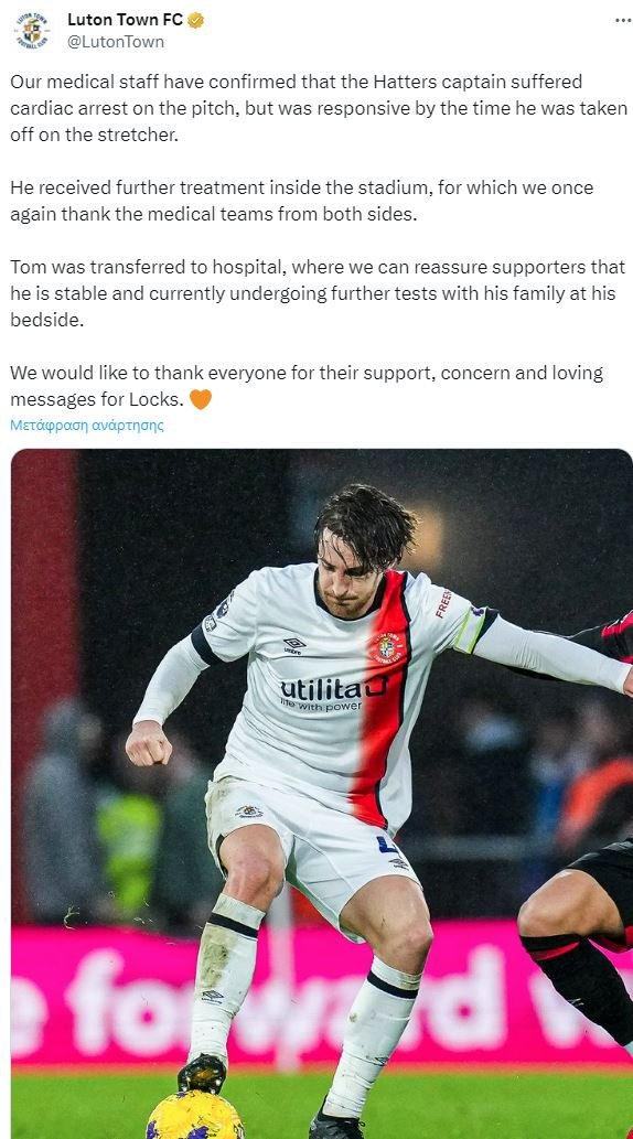 Ο αρχηγός της Λούτον, Τομ Λόκιερ, νοσηλεύεται σε «σταθερή» κατάσταση μετά από την καρδιακή ανακοπή που υπέστη κατά τη διάρκεια του σημερινού αγώνα με την Μπόρνμουθ για την Premier League.