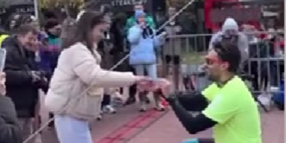 Ο δρομέας, αφού γονάτισε, έδωσε το δαχτυλίδι στη σύντροφό του, η οποία είχε μείνει έκπληκτη. Στη συνέχεια το ζευγάρι αγκαλιάστηκε κι έδωσε ένα φιλί, μέσα σε ένα κλίμα ενθουσιασμού από τους παρευρισκόμενους, οι οποίοι απαθανάτισαν το τρυφερό στιγμιότυπο.