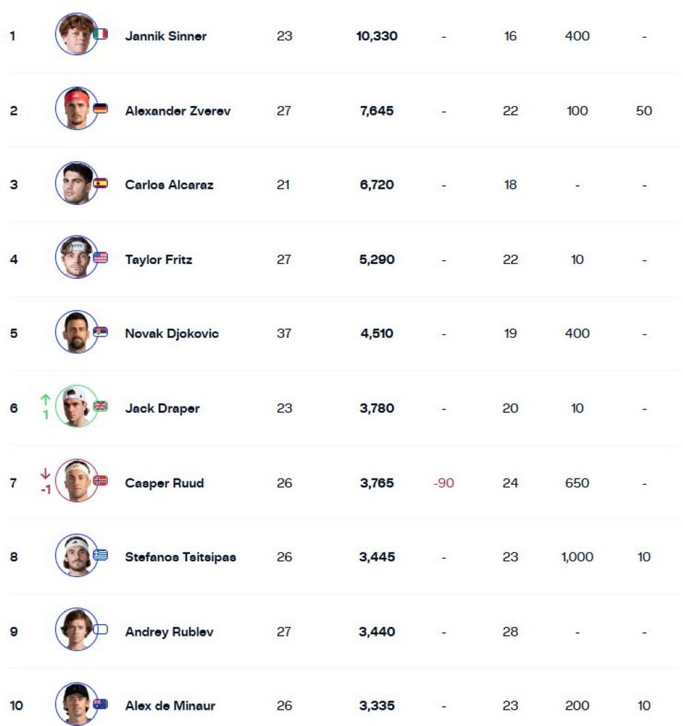 Η πρώτη πεντάδα δεν άλλαξε καθόλου, με τον Γιανίκ Σίνερ να παραμένει πρώτος, παρά την τιμωρία του, με τους Αλεξάντερ Ζβέρεφ, Κάρλος Αλκαράθ, Τέιλορ Φριτζ και Νόβακ Τζόκοβιτς να ακολουθούν κατά σειρά.