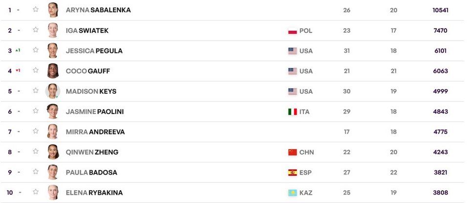 Σχετικά με την κορυφαία δεκάδα στο τένις σε επίπεδο γυναικών δεν άλλαξαν πολλά πράγματα. Στην κορυφή διατηρήθηκε η Αρίνα Σαμπαλένκα, με την Ίγκα Σβιάτεκ στη δεύτερη θέση. Η Τζέσικα Πέγκουλα προσπέρασε την Κόκο Γκοφ και την έριξε στην τέταρτη θέση, με την Μάντισον Κις να συμπληρώνει την πρώτη πεντάδα.