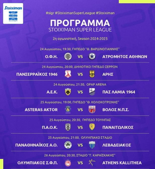 Ανακοινώθηκε από τη Super League το αναλυτικό πρόγραμμα της 2ης αγωνιστικής του πρωταθλήματος.