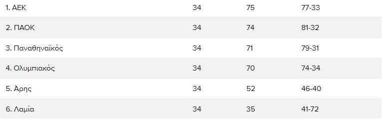 Για να πάρει τον τίτλο ο ΠΑΟΚ πρέπει να πάρει τα δύο τελευταία παιχνίδια με Παναθηναϊκό (εντός) και Άρη (εκτός) και να έχει απώλεια η ΑΕΚ στο Καραϊσκάκης, ενώ πρέπει να τονίσουμε ότι υστερεί σε πιθανή ισοβαθμία με την ΑΕΚ.