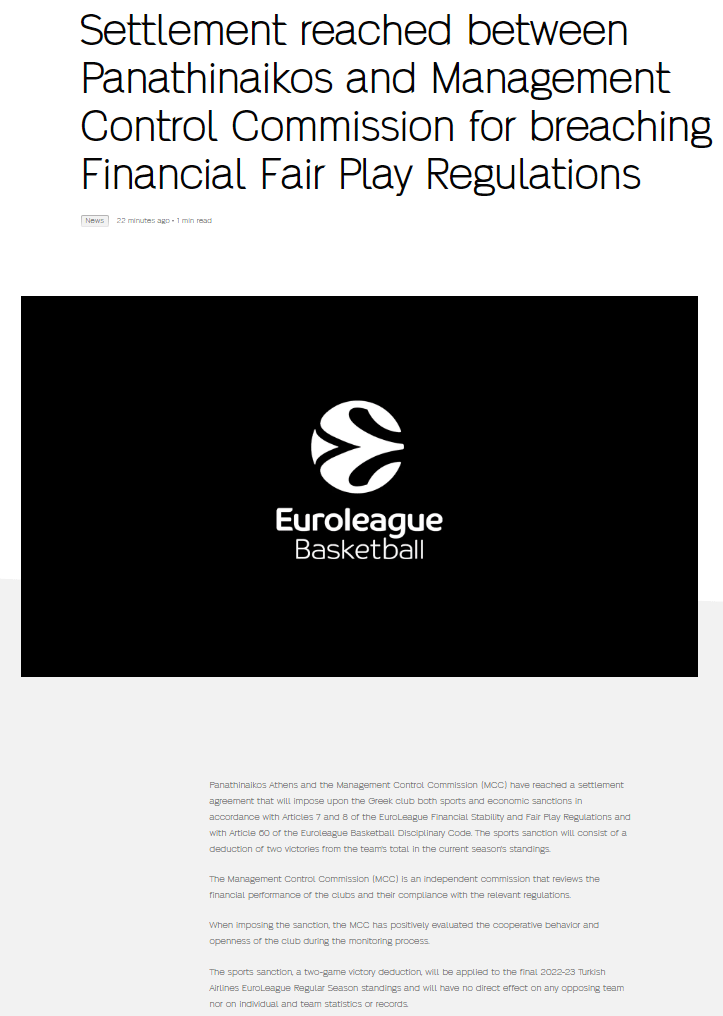«Ο Παναθηναϊκός και η Επιτροπή Ελέγχου Διαχείρισης έφτασαν σε συμβιβασμό που επιβάλλει στον ελληνικό σύλλογο τόσο αθλητικές όσο και οικονομικές κυρώσεις βάσει του άρθρου 7 και άρθρου 8 των κανονισμών του FSFPR και του άρθρου 60 του Πειθαρχικού Κώδικα της EuroLeague Basketball. Η αθλητική κύρωση συνίσταται σε αφαίρεση δύο νικών από το σύνολο στην κατάταξη της τρέχουσας αγωνιστικής περιόδου.
