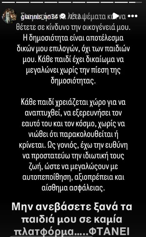 Μην ανεβάσετε ξανά τα παιδιά μου σε καμία πλατφόρμα… ΦΤΑΝΕΙ», έγραψε στο Ιnstagram o Γιάννης Αντετοκούνμπο.