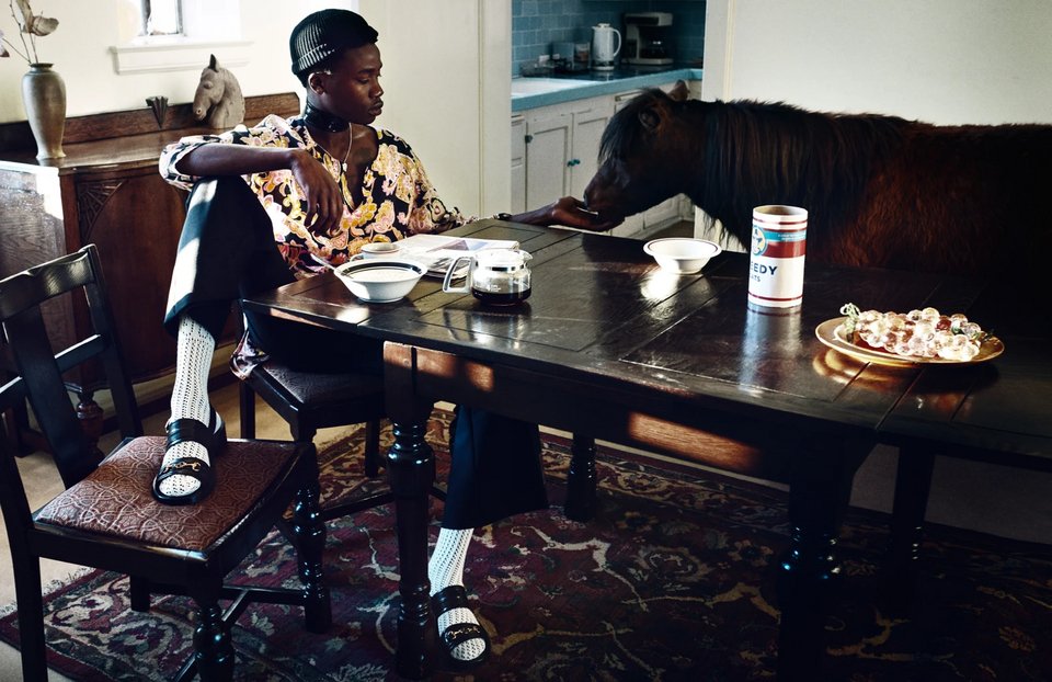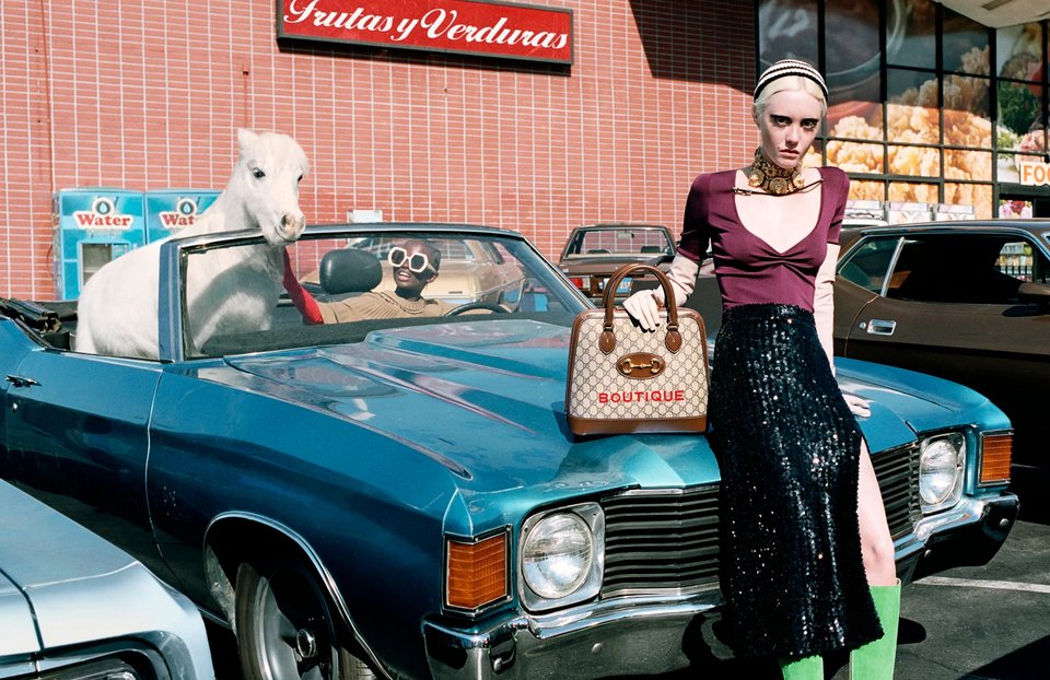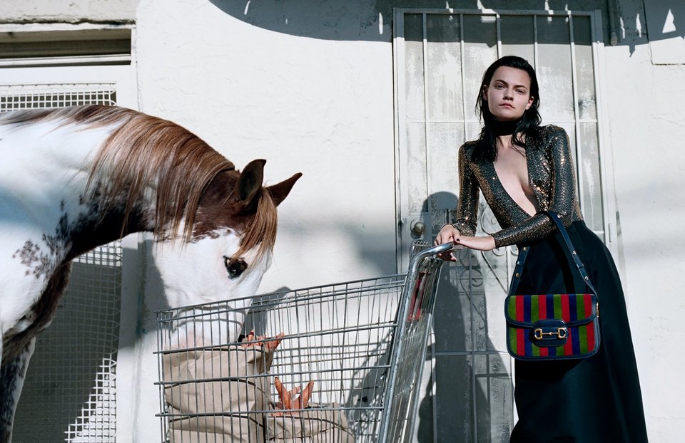 Σουρεαλισμός, παραδοξότητα, μια στη βάση της ποιητική προσέγγιση, με το χιούμορ πάντα να αναδύεται σε ριπές. Τα άλογα γίνονται συμπρωταγωνιστές της καμπάνιας, συνήθως σε συνδέσεις τριάδας (δύο μοντέλα και ένα άλογο). Δεν είναι απλώς μέρος μιας σύνθεσης, είναι συνομιλητής κυρίαρχος. Μέσα σε αεροσκάφη ρεμβάζοντας έξω από το παράθυρο. Στο συγκλονιστικό ξενοδοχείο Chateau Marmont, σε μια πισίνα με το στιλπνό τρίχωμα βρεγμένο, σε ένα τραπέζι με τσάι (tea time) σε ένα πάρκινγκ, στο καθιστικό ενός σπιτιού… Κάποιοι μπορεί να σχολιάσουν ότι ο οίκος Gucci και ο καλλιτεχνικός διευθυντής του Αllesandro Michele είδαν τα άλογα ως ένα αξεσουάρ μέσα στο πλαίσιο της αγάπης του για την εξτραβανγκάτζα, όμως το μήνυμα βρίσκεται αλλού.