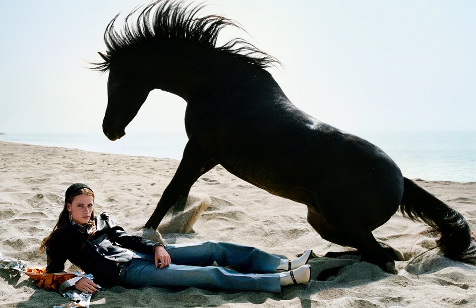 Ετσι, βλέπουμε τα μοντέλα να οδηγούν στους δρόμους του Λος Αντζελες με ιστορικά ανοιχτά αυτοκίνητα και ένα άλογο ως συνοδηγό με την χαίτη να κυματίζει, άλλο να πλένεται με τις μάνικες ενός πλυντηρίου αυτοκινήτων, να αγκαλιάζεται δυνατά από δυο γυναικεία χέρια με ψηλά κόκκινα λάτεξ γάντια, να ξαπλώνει υπνωτικά στη μοκέτα με ένα μοντέλο με βλέμμα ονειρικό να το χαϊδεύει… Η αλήθεια είναι ότι η ιστορία που ξετυλίγεται, η δύναμη της εικόνας, η κυριαρχία των αλόγων, βάζουν σε δεύτερο πλάνο τα ίδια τα ρούχα. Πρέπει να επανέλθεις για να επικεντρώσεις σε αυτά, μέσα σε μια εικόνα τέχνης που θυμίζουν Wes Anderson, Gregory Crewdson, κάποιες αναλαμπές Helmut Newton…