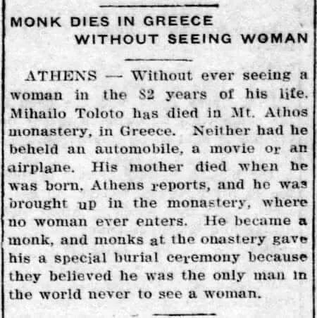 Ο Mihailo Tolotos, ένας ορθόδοξος έλληνας μοναχός στο Άγιο Όρος, έζησε για 82 χρόνια και πέθανε χωρίς ποτέ να έχει δει γυναίκα με τα μάτια του.