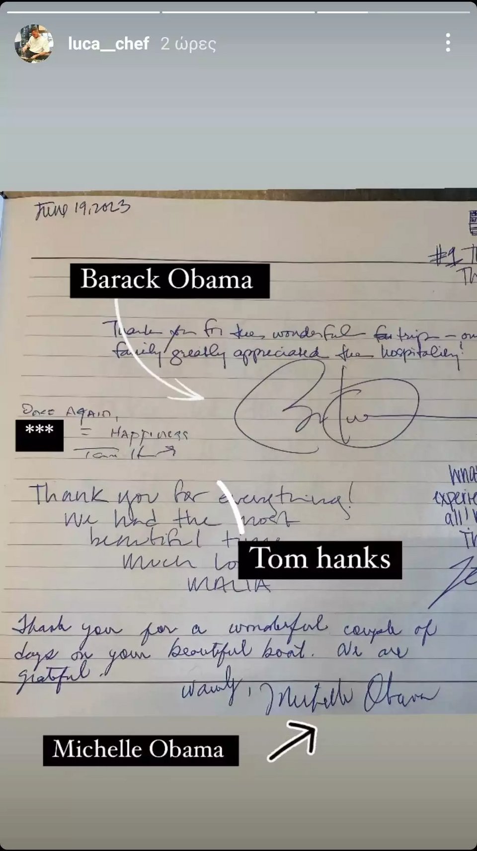 «Σας ευχαριστούμε για τις υπέροχες μέρες στο όμορφο σκάφος σας. Σας είμαστε ευγνώμονες», έγραψε στο σημείωμα η Μισέλ Ομπάμα. Ο Μπαράκ Ομπάμα ευχαρίστησε, με τη σειρά του, για «αυτό το υπέροχο ταξίδι» και δήλωσε «ιδιαίτερα ευγνώμων για τη φιλοξενία». «Ευτυχία», έγραψε ο Τομ Χανκς. «Ευχαριστούμε, περάσαμε υπέροχα», έγραψε η Μαλία Ομπάμα.