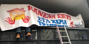 ΕΛΛΑΔΑ 11/04/2018 10:23 Ανέβασαν πανό πάνω στην κλούβα των ΜΑΤ- Συγκέντρωση διαμαρτυρίας για τους πλειστηριασμούς [εικόνες & βίντεο]