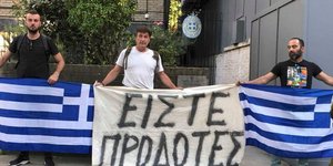 ΚΟΣΜΟΣ 27/06/2018 13:52 Διαδήλωση 3 ατόμων έξω από την ελληνική πρεσβεία στο Λονδίνο -«Είστε προδότες» [εικόνες]