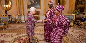 ΚΟΣΜΟΣ 08/12/2017 15:47 Η βασίλισσα Ελισάβετ ντυμένη ολόιδια με δύο Νιγηριανές καλεσμένες της! [εικόνες]