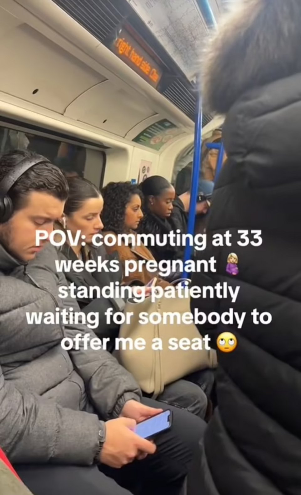 Στο βίντεο, η έγκυος καταγράφει τη σκηνή μέσα στο μετρό καθώς περνάει από πολλές στάσεις με την ίδια να στέκεται όρθια και κανένας να μην της προσφέρει τη θέση του.