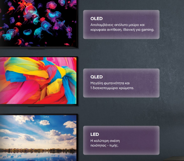 Η επιλογή της ιδανικής για εσένα τηλεόρασης πάντα μα πάντα πρέπει να σχετίζεται με τις ανάγκες και το χώρο σου. Αυτό που πρέπει να ξέρεις ως βασική πληροφορία για τις τηλεοράσεις είναι η τεχνολογία προβολής της εικόνας. Μιλάμε για τις OLED, QLED, LED ή NanoCell τηλεοράσεις.