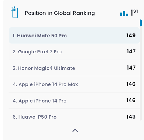 Όλα τα παραπάνω χαρακτηριστικά του HUAWEI Mate 50 Pro συντελούν στην εξαιρετική απόδοση η οποία επιβραβεύτηκε με το υψηλότερο σκορ στην ιστορία του DXOMARK, με την εξαιρετική βαθμολογία 149. Έτσι, το HUAWEI Mate 50 Pro είναι δικαιολογημένα ο βασιλιάς της φωτογραφίας σε smartphone αφήνοντας πίσω του όλους τους ανταγωνιστές της βιομηχανίας, χάρη στην αξιοσημείωτη συνολική απόδοση και τα φωτογραφικά χαρακτηριστικά του. Συγκεκριμένα, το HUAWEI Mate 50 Pro πέτυχε την καλύτερη βαθμολογία φωτογραφίας που έχει δοθεί μέχρι σήμερα, χάρη στα εξαιρετικά αποτελέσματα στις κατηγορίες: έκθεση, εστίαση και υφή/θόρυβος.
