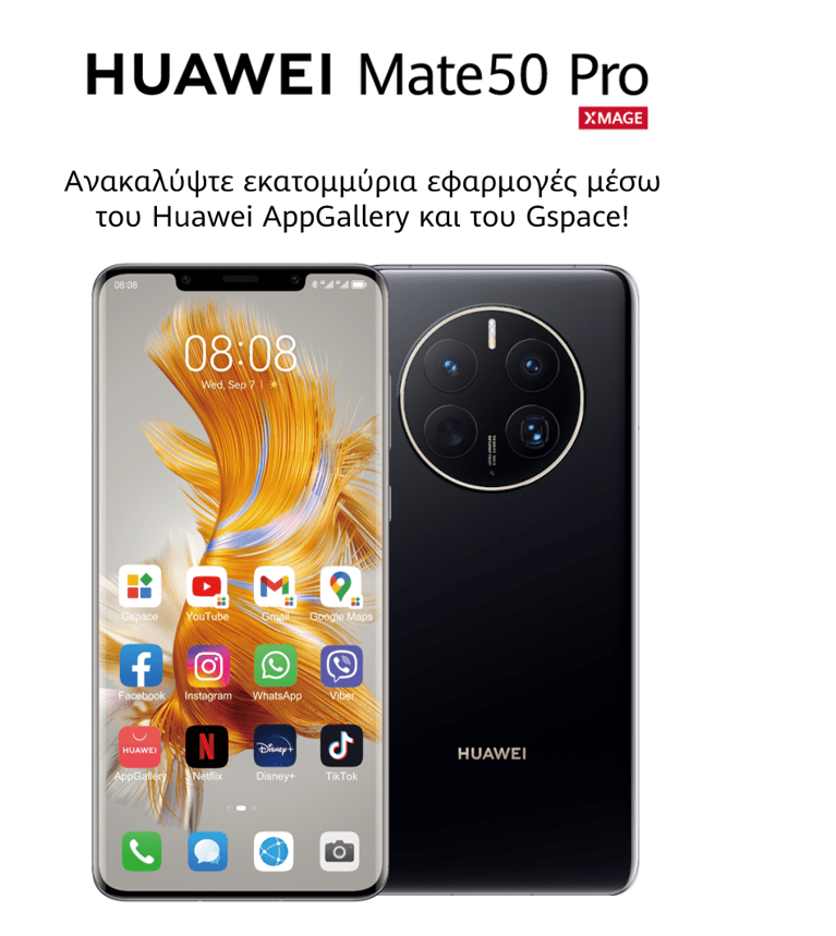 Το νέο HUAWEI Mate 50 Pro, όπως και κάθε συσκευή τηλεφώνου Huawei, διαθέτει το κατάστημα εφαρμογών AppGallery, μέσω του οποίου έχετε πρόσβαση σε όλες τις δημοφιλείς εφαρμογές, όπως WhatsApp, Viber, Instagram, Facebook Messenger, TikTok, αλλά και πολλαπλές εφαρμογές που έχουν αναπτυχθεί σε τοπικό επίπεδο για να προσφέρουν προηγμένες υπηρεσίες στους χρήστες. Στην Ελλάδα, το HMS οικοσύστημα περιλαμβάνει ένα ευρύ φάσμα εφαρμογών, όπως μεταξύ άλλων, υπηρεσίες τραπεζών (Εθνική Τράπεζα, Τράπεζα Πειραιώς, Alpha Bank, Eurobank), παραγγελία φαγητού (e-Food, BOX), εύρεσης ταξί (Taxiplon), πάροχοι κινητής τηλεφωνίας (Cosmote, Vodafone, Wind), ενώ εμπλουτίζεται διαρκώς για να προσφέρει μία προηγμένη εμπειρία χρήσης. Παράλληλα, μέσα από τη 3rd party εφαρμογή Gspace, διαθέσιμη χωρίς διαφημίσεις στο AppGallery, μπορείτε να εγκαταστήσετε τις Google εφαρμογές που χρειάζεστε ή έχετε συνηθίσει να χρησιμοποιείτε, όπως YouTube, Google Maps και άλλες εφαρμογές και υπηρεσίες, με πολύ απλά βήματα.