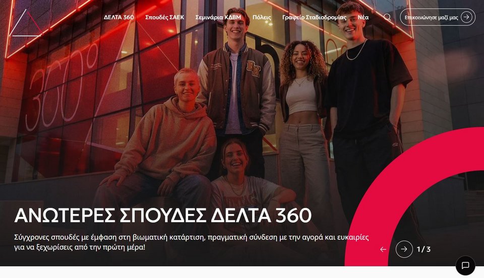 Στόχος της νέας ψηφιακής παρουσίας είναι να παρέχει στους ενδιαφερόμενους έναν πιο άμεσο τρόπο ενημέρωσης για τα 100 και πλέον διετή προγράμματα σπουδών που λειτουργούν στην Ανώτερη Σχολή ΔΕΛΤΑ 360 (ΙΕΚ), αλλά και για τις υπηρεσίες του Κέντρου Δια Βίου Μάθησης (Κ.Δ.Β.Μ.) ΔΕΛΤΑ 360, που περιλαμβάνουν ταχύρρυθμα σεμινάρια, προγράμματα εξειδίκευσης επαγγελματιών, voucher εργαζομένων/ ανέργων και σεμινάρια υποχρεωτικής επαγγελματικής κατάρτισης.