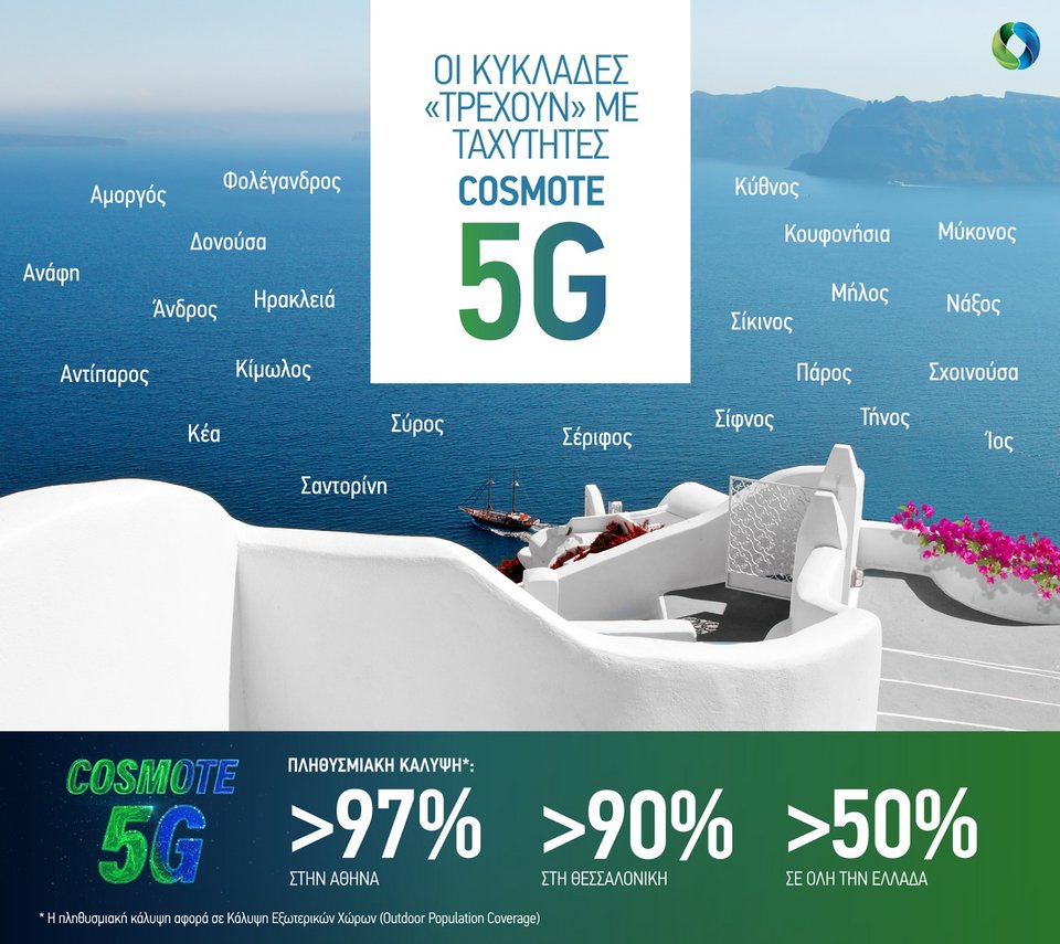 Ανάφη, Άνδρος, Αντίπαρος, Δονούσα, Ηρακλειά, Ίος, Κέα, Κίμωλος, Κύθνος, Μήλος, Μύκονος, Νάξος, Πάρος, Σέριφος, Σίφνος, Σύρος, Σχοινούσα, Τήνος και Φολέγανδρος «τρέχουν» από τις αρχές Ιουλίου με ταχύτητες 5G, ενώ ήδη από τον Μάιο το δίκτυο 5ης γενιάς της COSMOTE είναι διαθέσιμο και στη Σαντορίνη, την Αμοργό, τα Κουφονήσια και την Σίκινο.