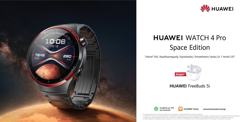 Με την αγορά ενός HUAWEI WATCH 4 Pro έως και τις 31 Μαΐου, παίρνετε δώρο τα απίθανα ασύρματα ακουστικά HUAWEI FreeBuds 5i.