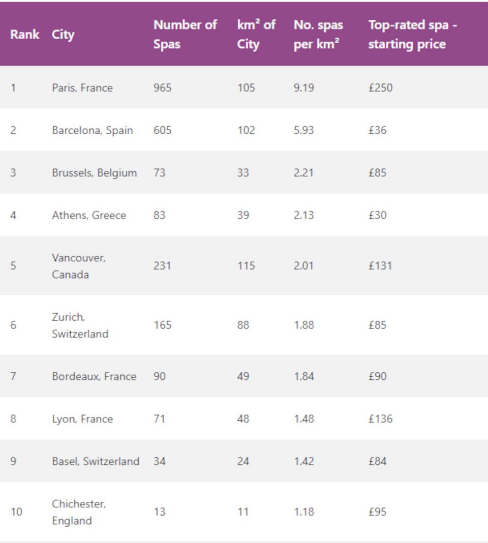 Η βρετανική έρευνα ειδικών στον τομέα του τουρισμού του φορέα money.co.uk υπολόγισαν τις πόλεις με τα περισσότερα spa ανά τετραγωνικό χιλιόμετρο.