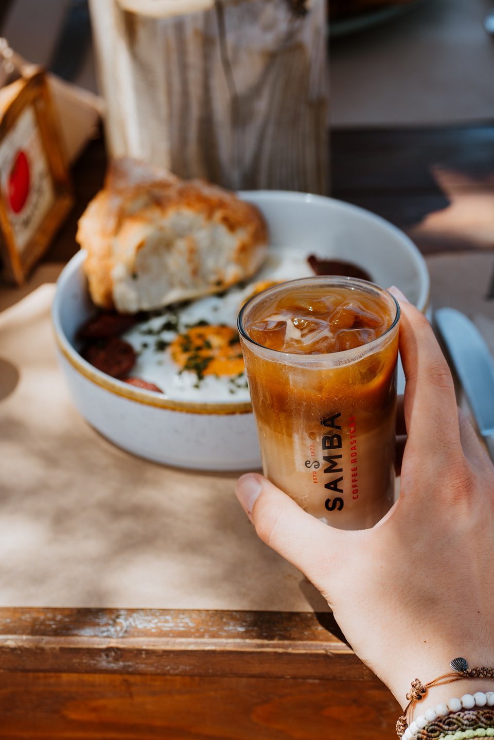 Παντρεύοντας δε, τη λογική του πρωινού με το brunch δημιουργεί το δικό του γεμάτο burger. Εδώ θα το βρεις στην ελληνική εκδοχή του με τον καβουρμά Θράκης να τον αγκαλιάζει η λιωμένη γραβιέρα Ίου και το τηγανιτό αυγό από πάνω «να καμαρώνει».