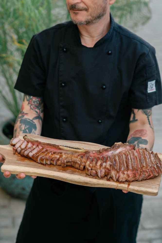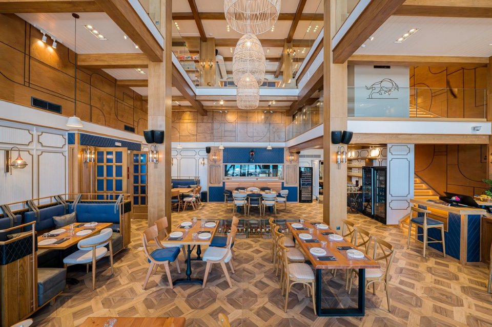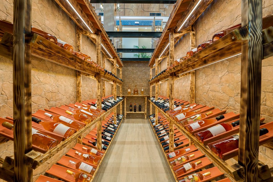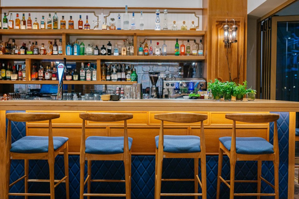 Η επιβλητική μπάρα και το υπόγειο κελάρι (που μπορείς να κρυφοκοιτάξεις από πάνω μέσα από ένα γυάλινο τζάμι) με επιλεγμένες ετικέτες κρασιών προσθέτουν μια ακόμη ατμοσφαιρική νότα. Στο μέλλον, σχεδιάζεται η προσθήκη πισίνας στην οροφή για μια μοναδική εμπειρία «pool meat bar».