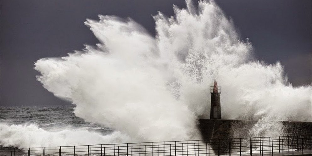 Τα κύματα -θηρία χτυπούν με μανία τη στεριά, ενώ οι θυελλώδεις άνεμοι παρασύρουν ό,τι βρουν στο πέρασμά τους.